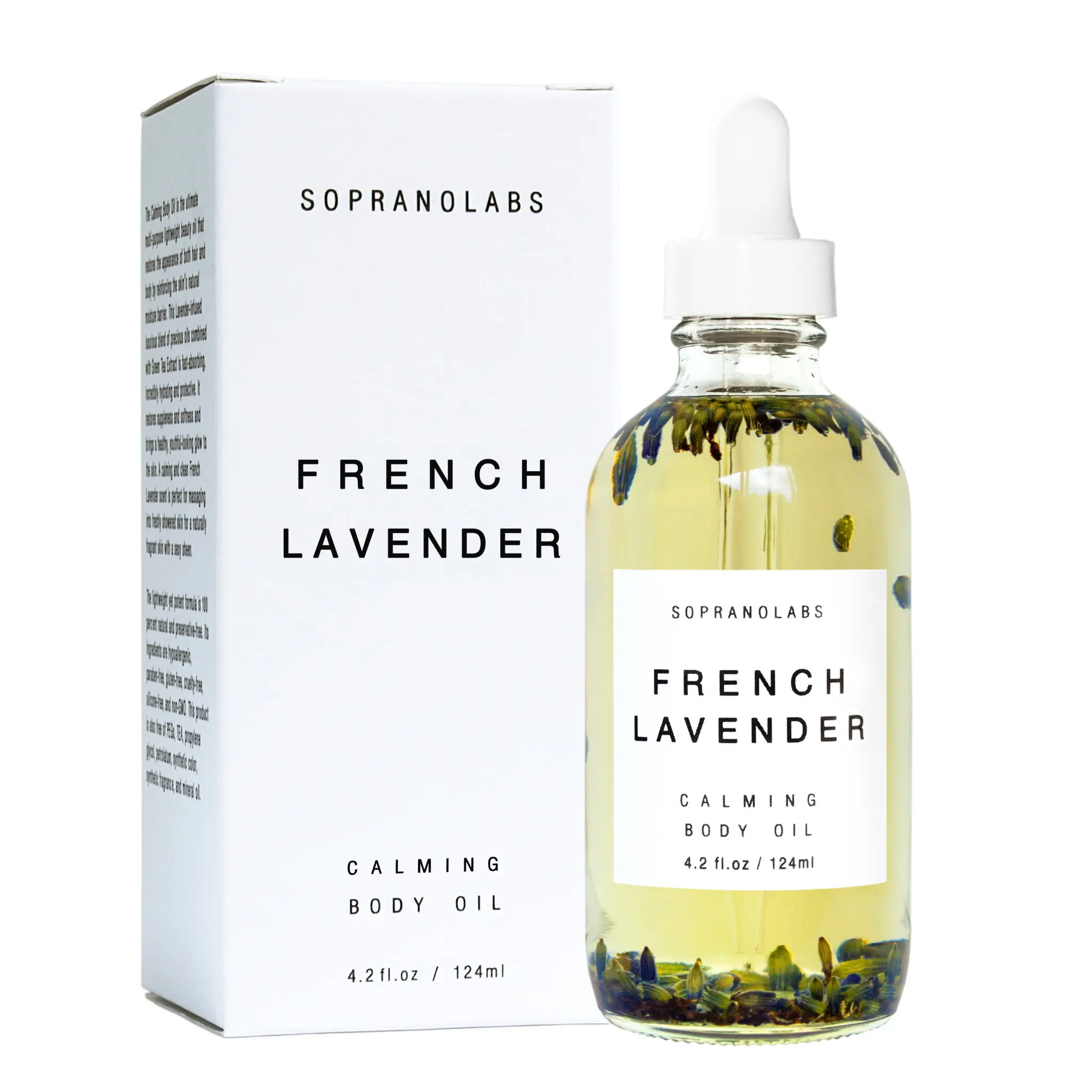 The listing is for one glass bottle of 4.2 fl. Oz. (125 ml) Lavender infused Body Oil, with a convenient orifice reducer, aluminium cap top and recyclable box.